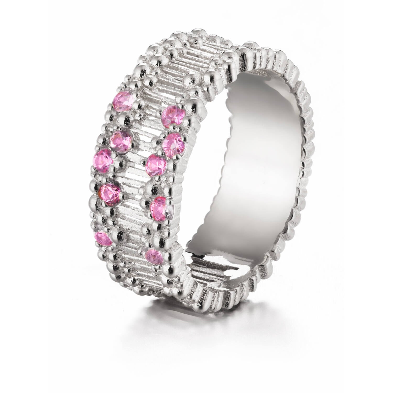 Lumoavan Tiara-sormus mallissa L82241450000 on valkokultainen runko ja 10 kauniisti loistavaa pinkkiä safiiria (halkaisija 2 mm). Sormuksen leveys on 7,7 mm, ja se on suunniteltu juhlahetkiin, mutta sopii hyvin myös kihla- tai vihkisormukseksi. Materiaali on 14 karaatin valkokultaa (585).