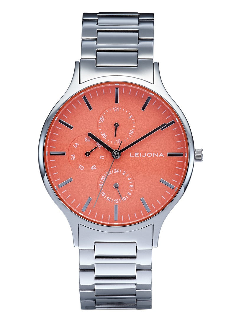 - Kellotaulu: Korallin sävyinen, joka tuo raikkaan ja ainutlaatuisen ilmeen.