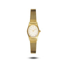 Kellossa on vaalea kellotaulu ja sirot kullanväriset viisarit, jotka korostavat sen pelkistettyä eleganssia. Verkkomainen ranneke istuu kevyesti ja mukavasti ranteessa.