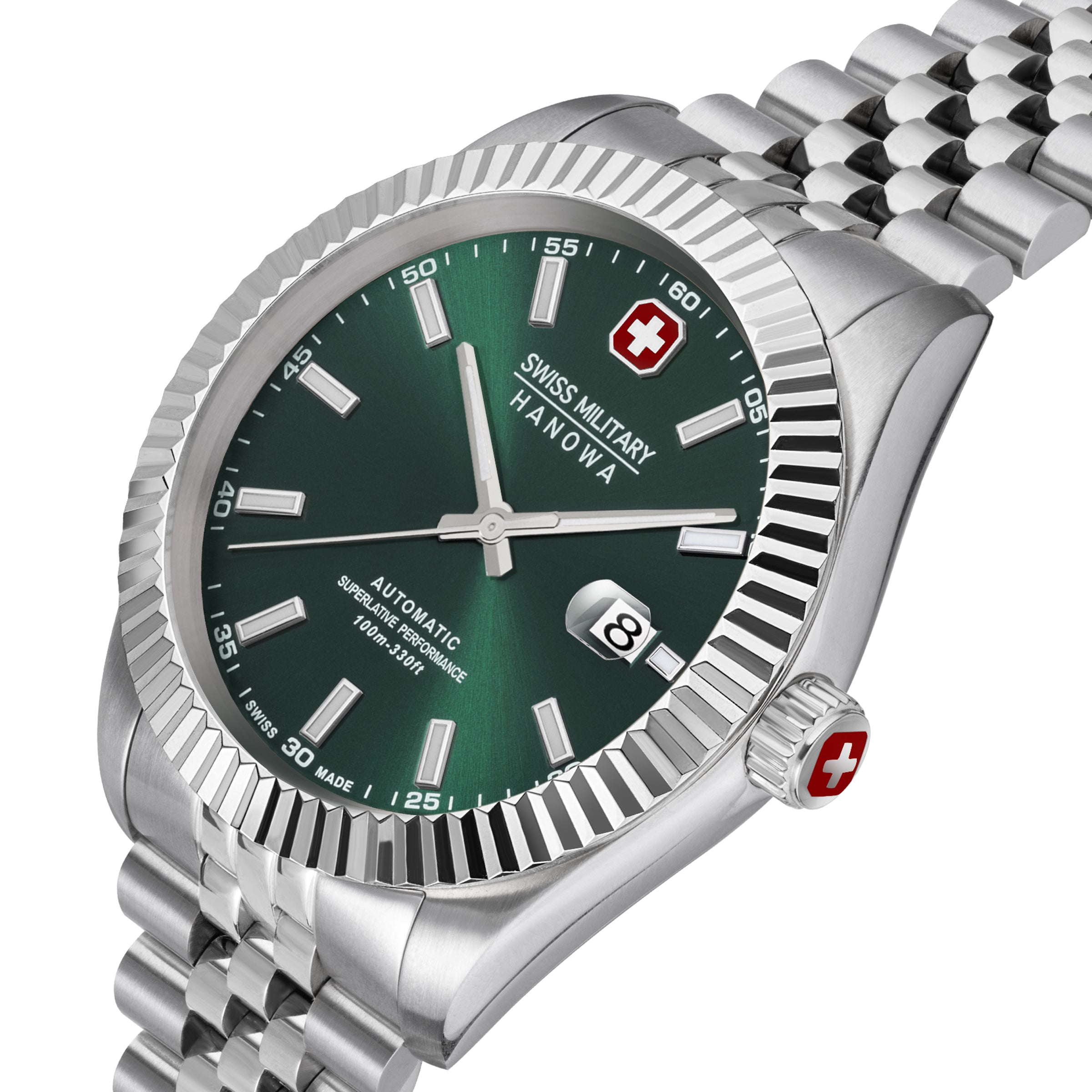 Tyylikäs design: Vihreä kellotaulu, hopeanväriset osoittimet ja teräsranneke luovat klassisen ja hienostuneen kokonaisuuden.